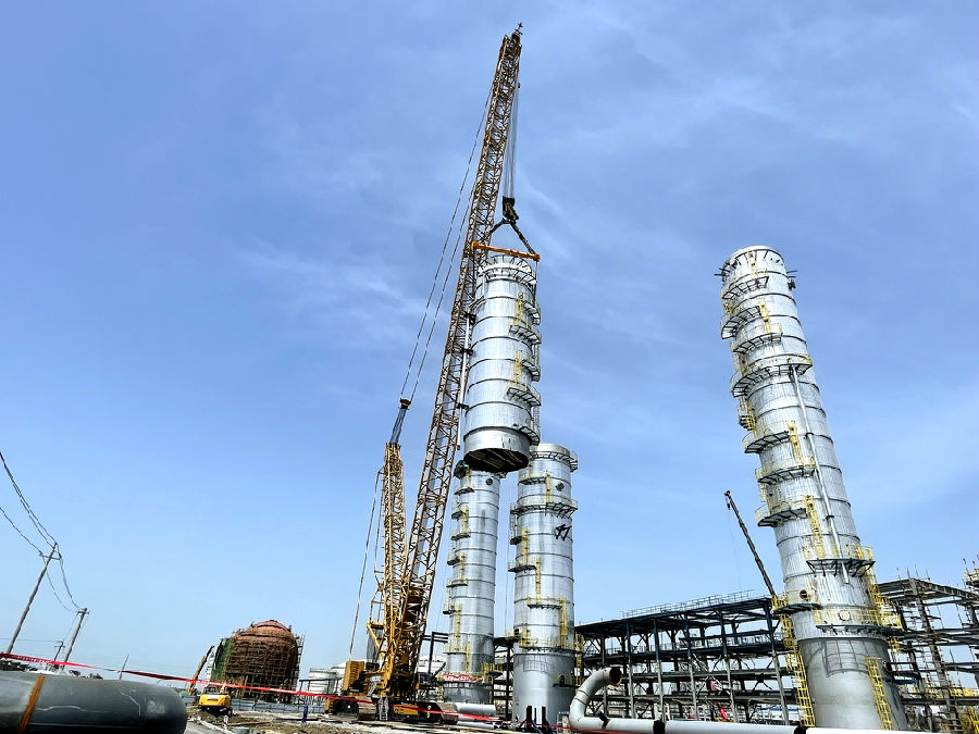 乙醇精制塔上塔上段直徑7.8米,吊裝總高74.4米、總重約220噸,吊裝主吊采用1250噸履帶吊,400噸履帶吊溜尾。設備于4月16日11時18分起吊,經過2小時完成組對合口,順利啟動焊接工作,預計焊接工作將持續4至5天。