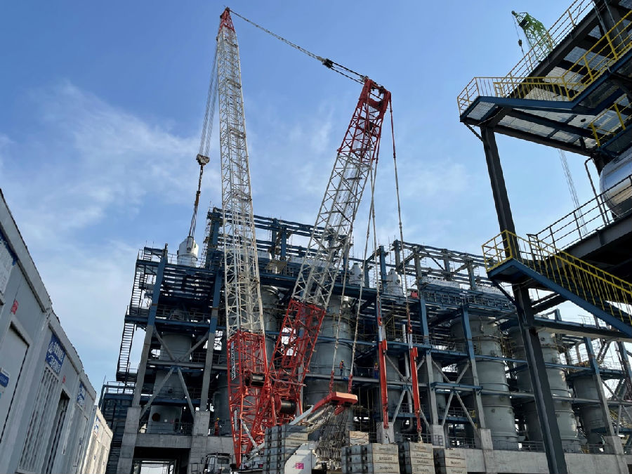 期間,項目還陸續完成二甲醚塔器、羰基化及產品分離繞管換熱器等大件設備吊裝,精準規劃吊車轉場,提高吊車使用效率。