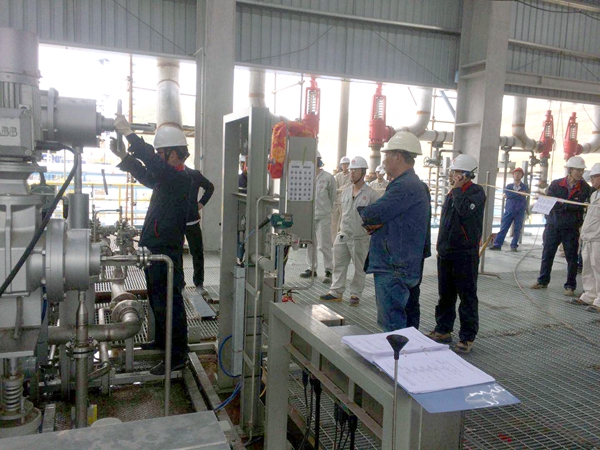 為順利完成兩臺(tái)壓縮機(jī)負(fù)荷試車,項(xiàng)目組抽調(diào)技術(shù)骨干,配合業(yè)主對(duì)界區(qū)介質(zhì)(中壓蒸汽、氮?dú)狻x表風(fēng)、循環(huán)水等)運(yùn)行參數(shù)、提前啟動(dòng)汽輪機(jī)暖機(jī)、防喘振系統(tǒng)調(diào)試及模擬測(cè)試、一二三級(jí)系統(tǒng)管支架、儀表運(yùn)行及參數(shù)等環(huán)節(jié)逐一進(jìn)行了核查。在完成機(jī)組、系統(tǒng)、安全等相應(yīng)手續(xù)簽字后,下午16時(shí)35分,丙烯制冷壓縮機(jī)組開始負(fù)荷試車,經(jīng)過3個(gè)小時(shí)的平穩(wěn)運(yùn)行后,中控顯示系統(tǒng)溫度、壓力、機(jī)組振動(dòng)值均在正常運(yùn)行范圍內(nèi)。隨后,試車團(tuán)隊(duì)又開始乙烯制冷壓縮機(jī)機(jī)組的負(fù)荷試車。晚上22時(shí)10分,該設(shè)備運(yùn)行平穩(wěn),各項(xiàng)參數(shù)運(yùn)行數(shù)據(jù)正常,試車一次成功。至此,ACO裝置同日完成了兩臺(tái)壓縮機(jī)試車任務(wù)。